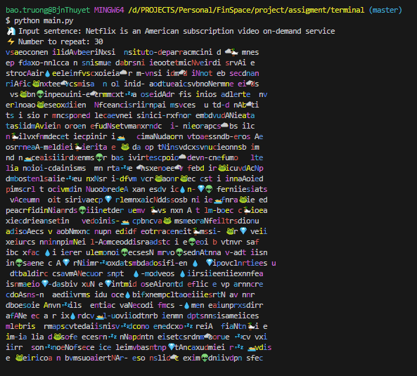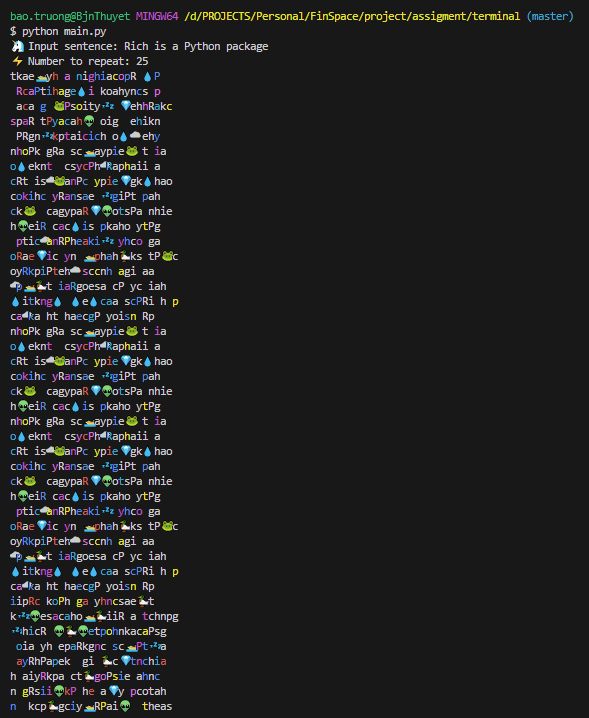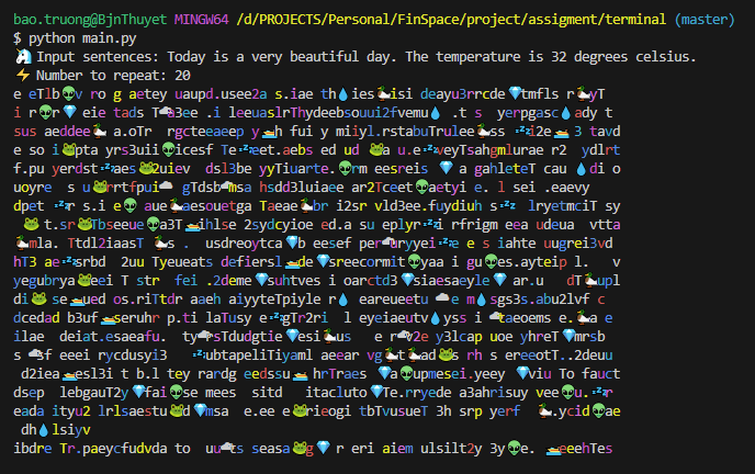 Repeat n-integer times: shuffle tokens split of sentence with color change by characters and annotate with random emoji