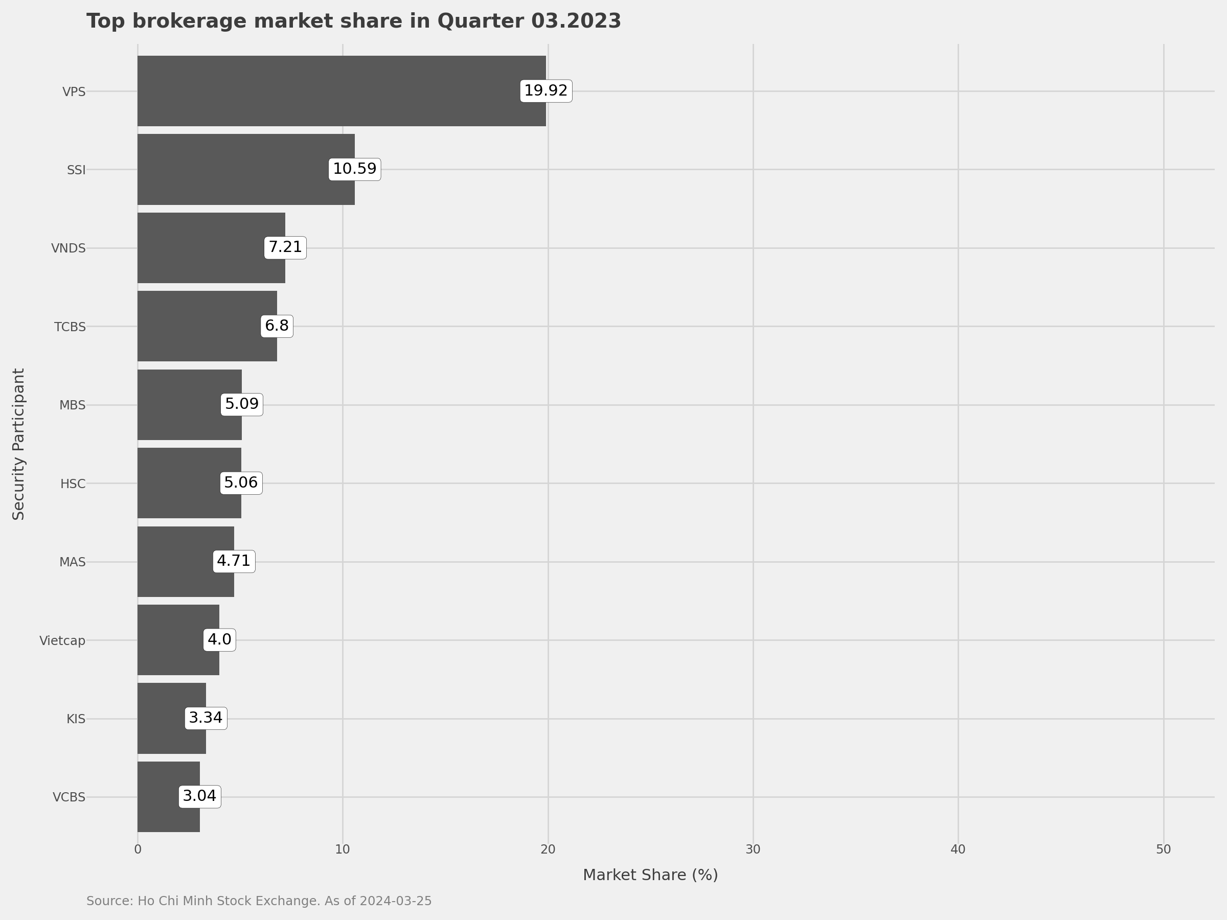 Fetch the data from Ho Chi Minh Stock Exchange about the market share of brokerage in the latest period then represent the ordered column chart for it.